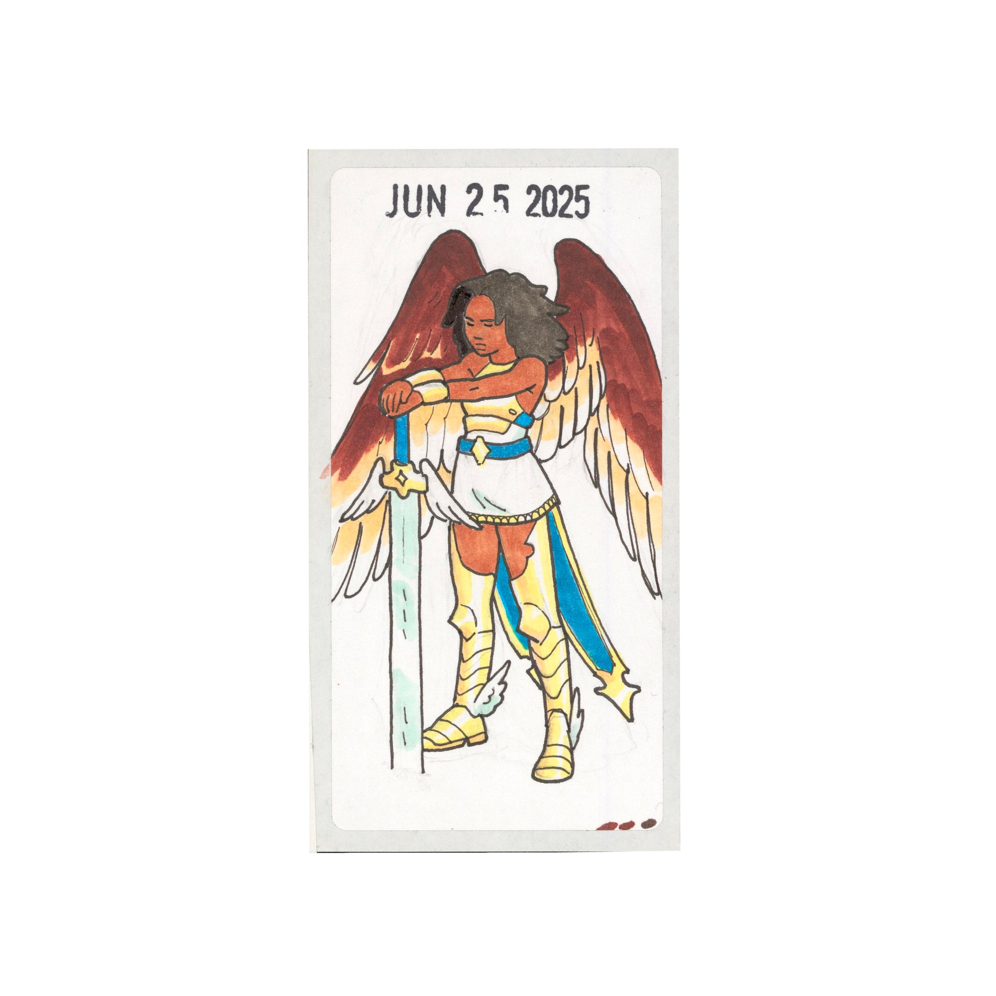 2x4 Original art adhesive sticker. Made with Copic markers and Micron pens. Made this after playing some Magic the gathering and thought I'd try my hand at girls with wings/swords.