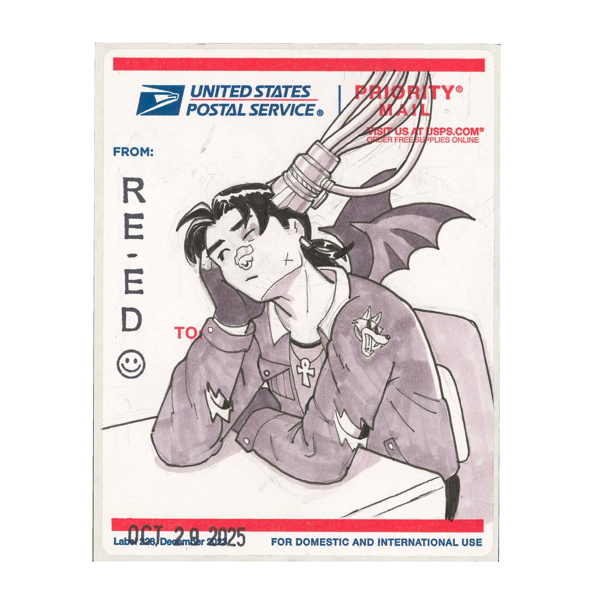 4x6 original art USPS shipping label. Drawn for Inktober day 29 using micron pens and Spectra markers.