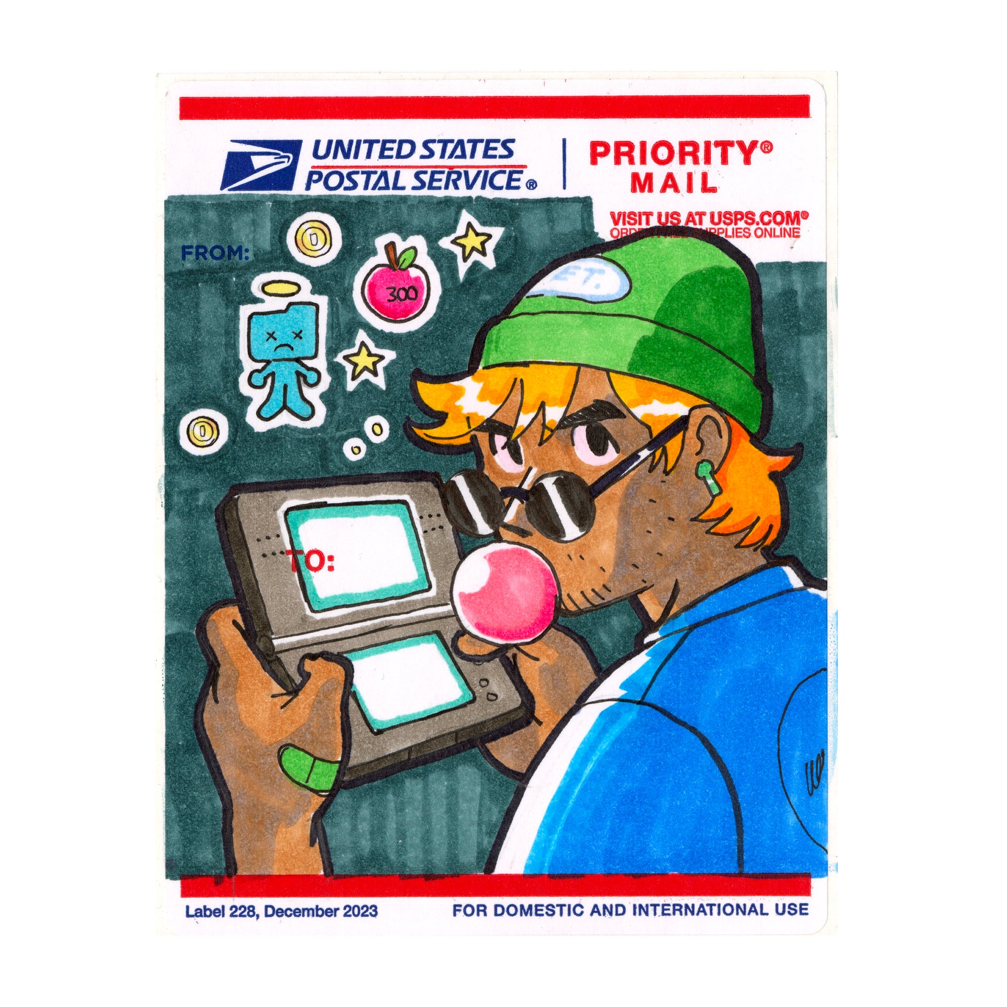 4x6 original art USPS shipping label. Made in memory of my old Nintendo DS. I miss you. Made with Copic markers and Micron pens.